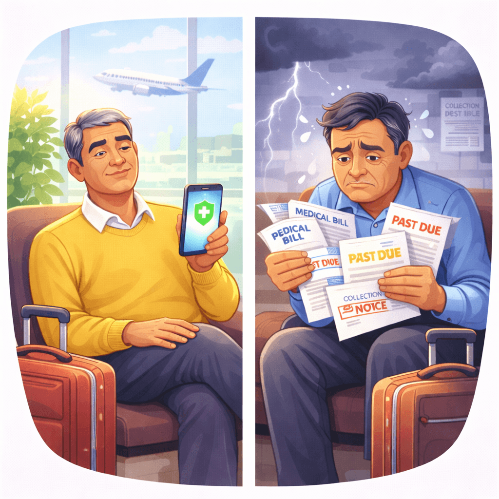 Compares the financial impact of having Visitor Insurance versus paying medical bills without insurance.